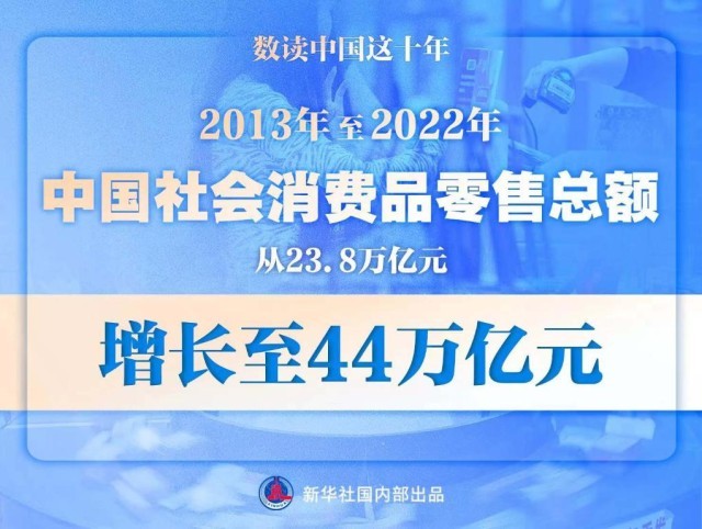 2013年至2022年10年間,中國社會消費品零售總額從23.8萬億元增長至44萬億元,穩(wěn)居全球第二大消費市場、第一大網(wǎng)絡零售市場和全球第二大進口市場。消費“主引擎”動力強勁,為推動高質量發(fā)展、創(chuàng)造高品質生活、構建新發(fā)展格局提供有力支撐。