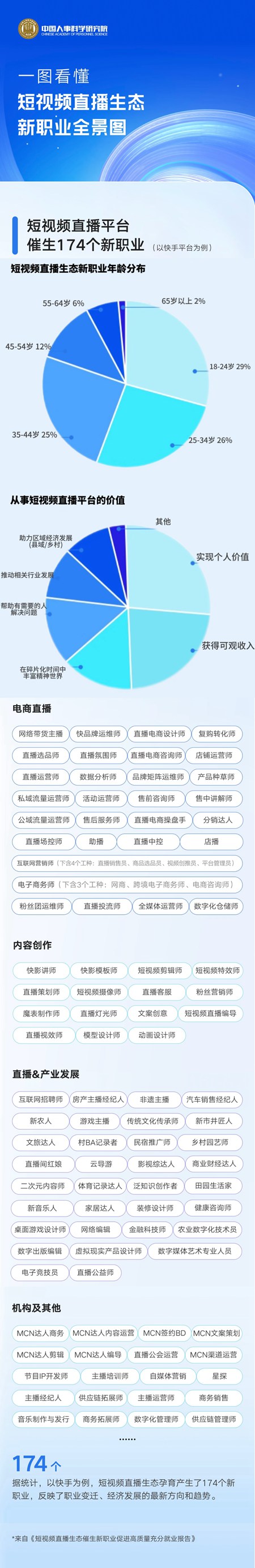 中國人事科學(xué)研究院近期發(fā)布的《短視頻直播生態(tài)催生新職業(yè)促進(jìn)高質(zhì)量充分就業(yè)報(bào)告》顯示,一塊屏幕背后發(fā)生了諸多變化:中青年成短視頻直播生態(tài)新職業(yè)的主力軍。其中,18-24歲占29%,25-34歲占26%,35-44歲占25%。18-34歲占比達(dá)到55%。《中華人民共和國職業(yè)分類大典(2022年版)》的1639個(gè)職業(yè)中,短視頻平臺(tái)快手覆蓋八成以上的數(shù)字職業(yè),為勞動(dòng)者提供了更廣闊的職業(yè)發(fā)展空間。