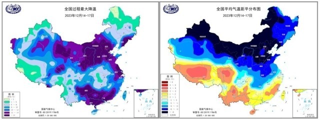 12月14-17日全國大部降溫迅猛(左)氣溫遠(yuǎn)低于歷史同期(右,“距平”為實(shí)測數(shù)據(jù)與歷史同期之差)