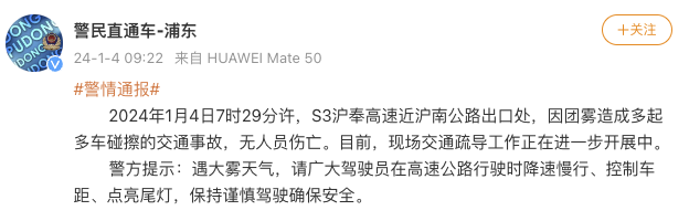 央視網(wǎng)消息:據(jù)警民直通車-浦東通報,1月4日7時29分許,S3滬奉高速近滬南公路出口處,因團霧造成多起多車碰擦的交通事故,無人員傷亡。目前,現(xiàn)場交通疏導(dǎo)工作正在進一步開展中。