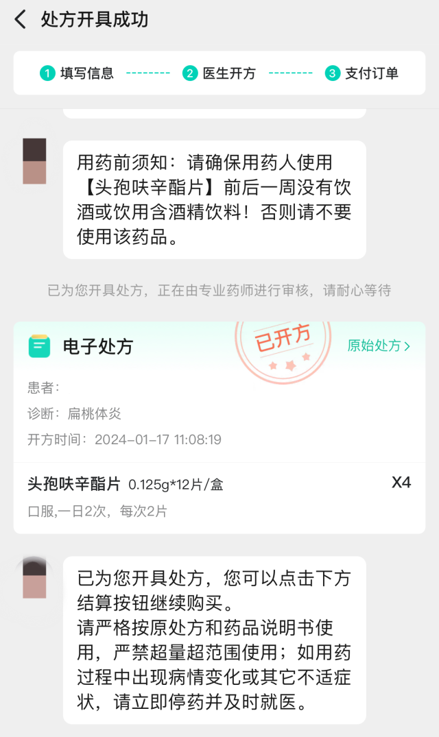 電商平臺(tái)上,記者再次搜索頭孢類藥物,也只需提交用藥人信息,選擇已確診疾病,確認(rèn)后即可問(wèn)診開(kāi)方。點(diǎn)擊“無(wú)需補(bǔ)充,立即開(kāi)方”,不到一分鐘,處方單便已生成。