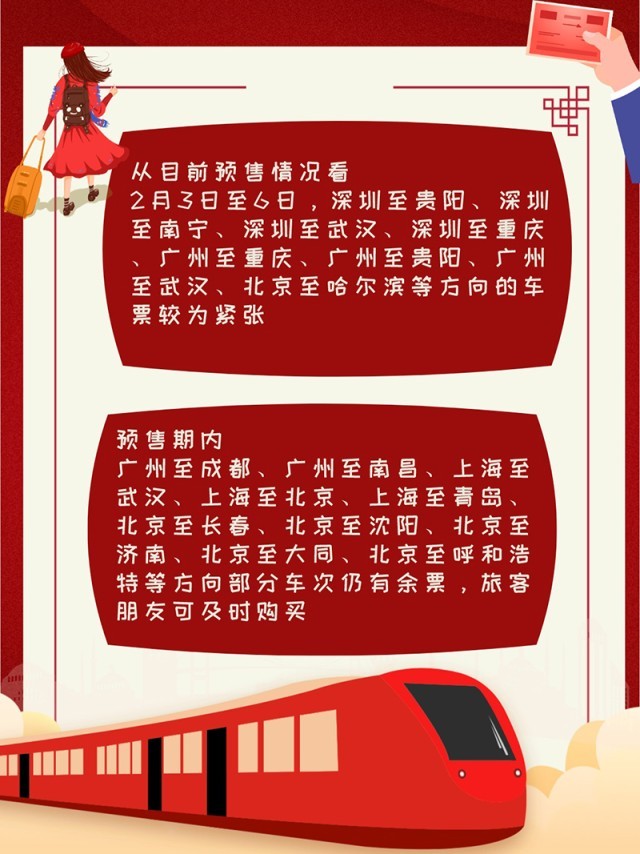 從目前預(yù)售情況看,2月3日至6日,深圳至貴陽、深圳至南寧、深圳至武漢、深圳至重慶、廣州至重慶、廣州至貴陽、廣州至武漢、北京至哈爾濱等方向的車票較為緊張。預(yù)售期內(nèi),廣州至成都、廣州至南昌、上海至武漢、上海至北京、上海至青島、北京至長春、北京至沈陽、北京至濟南、北京至大同、北京至呼和浩特等方向部分車次仍有余票,旅客朋友可及時購買。