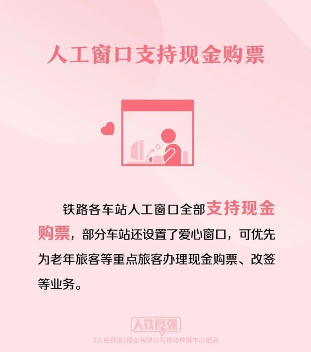 鐵路各車站人工窗口全部支持現(xiàn)金購票,部分車站還設(shè)置了愛心窗口,可優(yōu)先為老年旅客等重點旅客辦理現(xiàn)金購票、改簽等業(yè)務(wù)。
