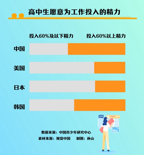與此同時,調(diào)查也顯示,中國高中生在就業(yè)上更為務(wù)實(shí),贊同先就業(yè)后擇業(yè),近八成(78.0%)表示“即使找不到理想的工作也應(yīng)該先工作為好”,比例遠(yuǎn)高于美(61.1%)、日(30.2%)、韓(55.9%)三國受訪高中生。