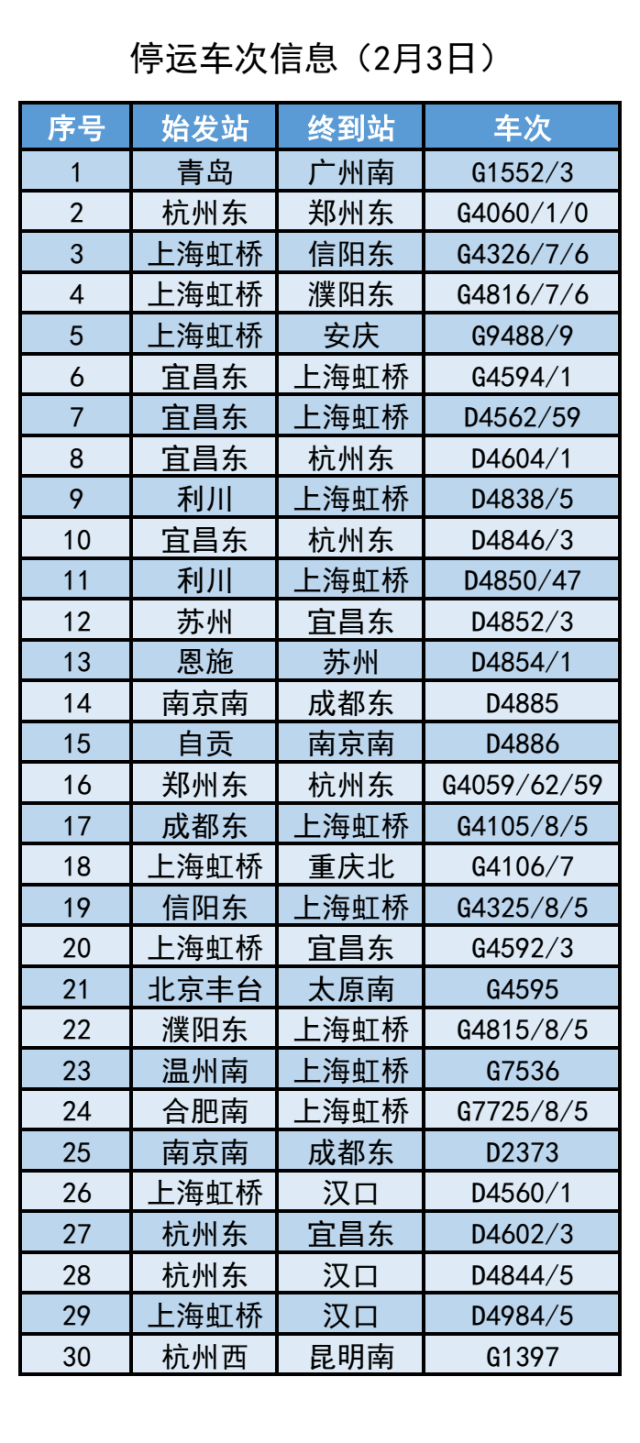 截至2月3日7時30分,計劃停運2月3日至2月4日間39趟旅客列車。