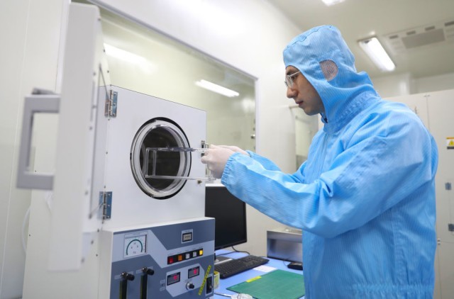 在位于沈陽市的中國科學院金屬研究所納米碳基電子器件超凈實驗室,孫東明從前處理設備腔體中取出實驗樣品(2月24日攝)。