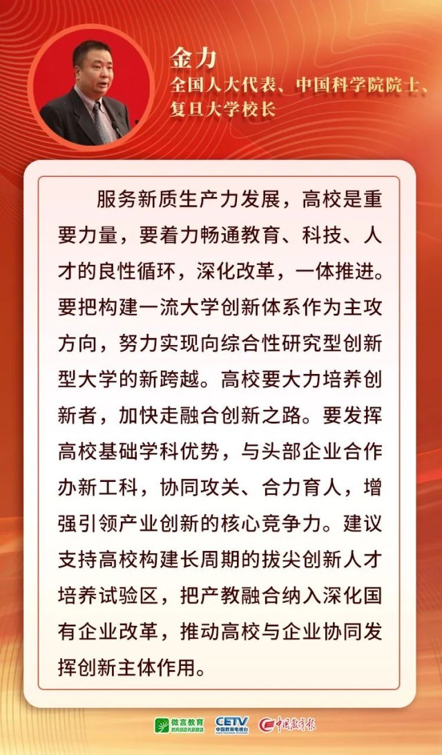 2024年政府工作報告提出,大力推進(jìn)現(xiàn)代化產(chǎn)業(yè)體系建設(shè),加快發(fā)展新質(zhì)生產(chǎn)力。培育和發(fā)展新質(zhì)生產(chǎn)力,創(chuàng)新是核心要素,基礎(chǔ)和先導(dǎo)靠教育。高校如何發(fā)揮支撐作用,推動新質(zhì)生產(chǎn)力發(fā)展?5位代表委員,同時也是大學(xué)書記、校長,提出了建議,來聽他們怎么說——