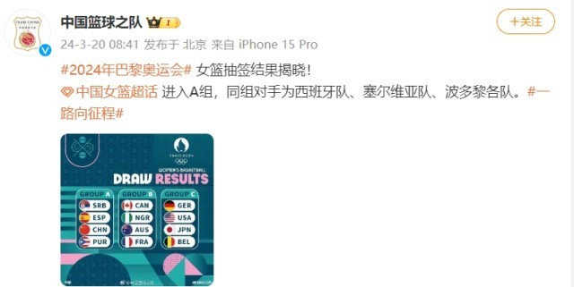 央視網消息:據中國籃球之隊官方微博消息,2024年巴黎奧運會女籃抽簽結果揭曉!中國女籃進入A組,同組對手為西班牙隊、塞爾維亞隊、波多黎各隊。