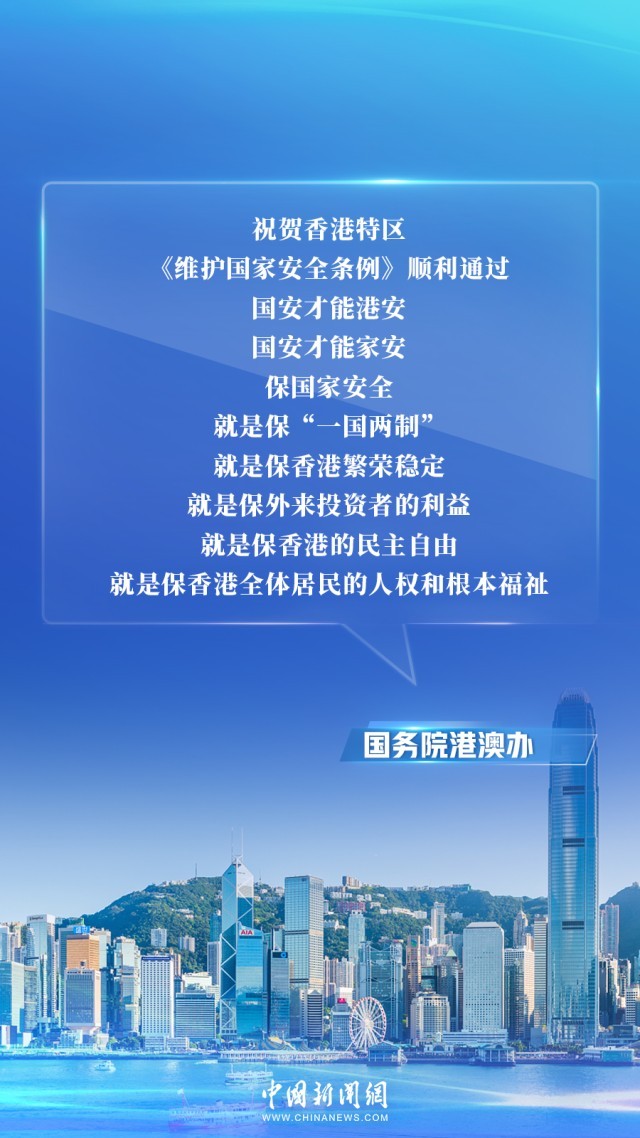 國務院港澳辦強調(diào),香港國安條例順利通過,為保持香港長期繁榮穩(wěn)定、推動“一國兩制”實踐行穩(wěn)致遠提供更加堅實的制度保障。香港國安條例全面有效維護國家安全,充分尊重和保障人權(quán),更好統(tǒng)籌發(fā)展和安全。