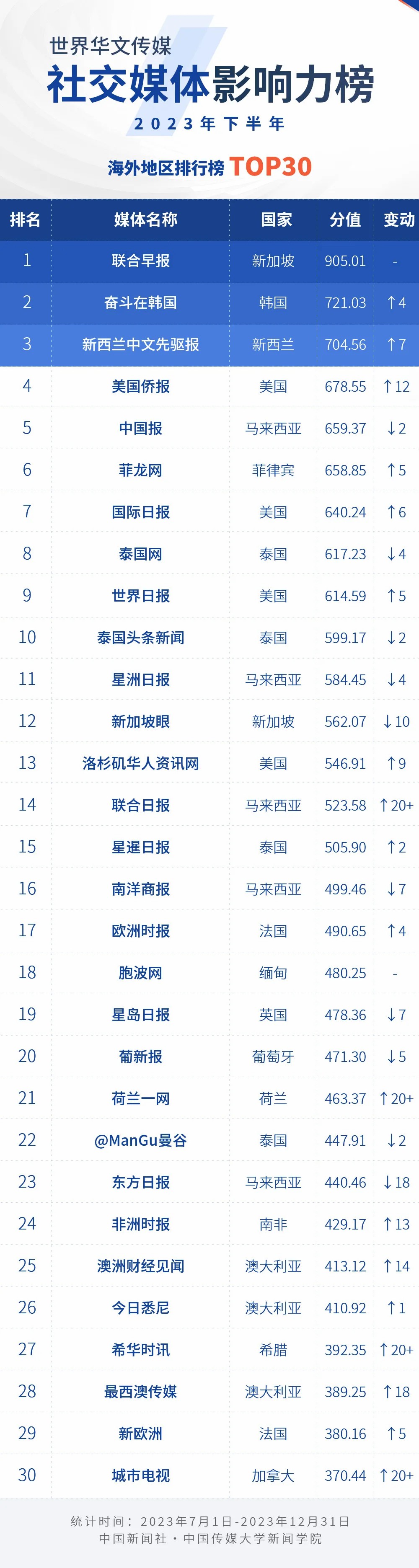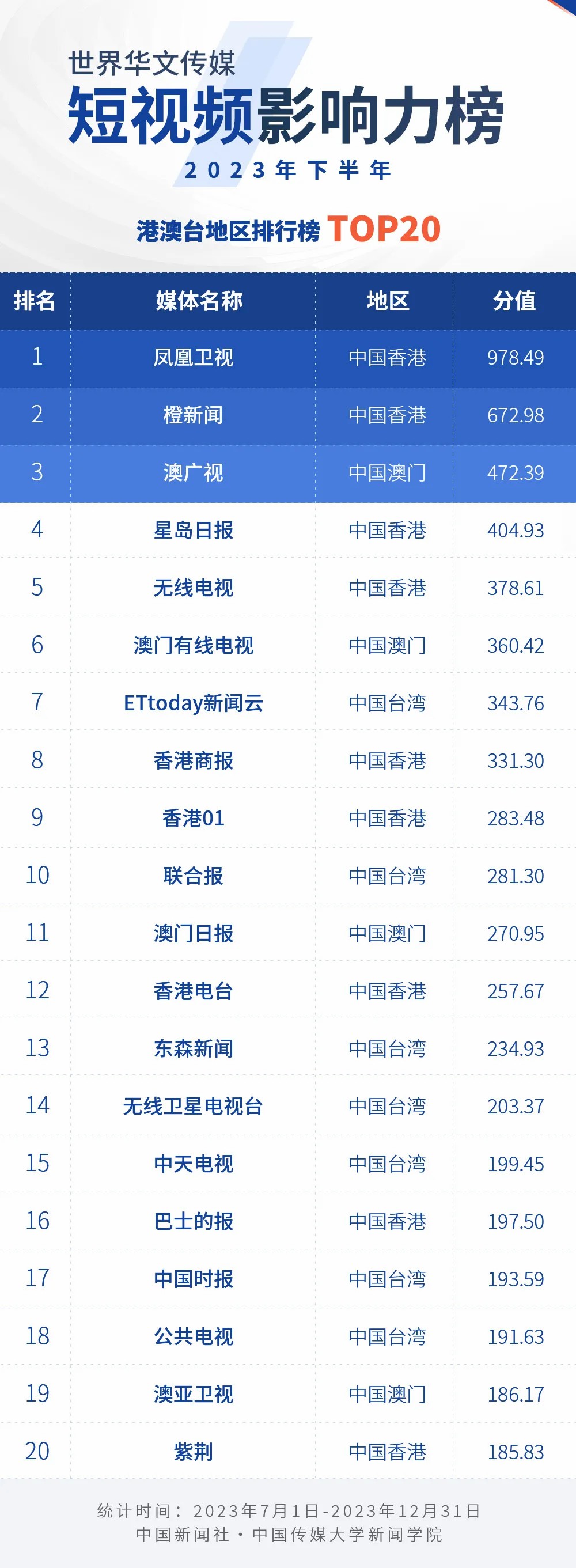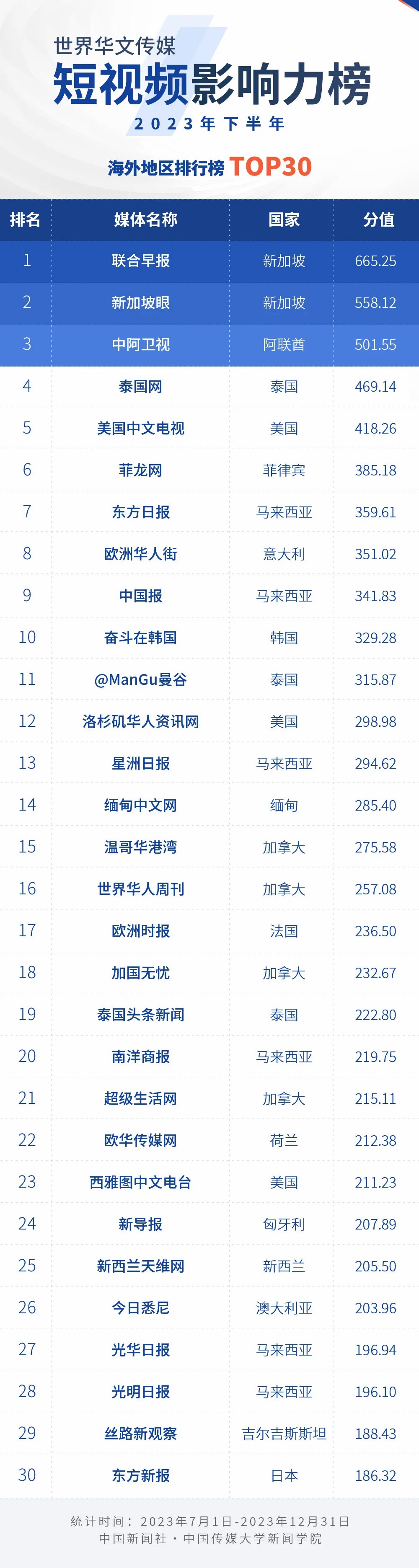 中國新聞社與中國傳媒大學新聞學院持續(xù)開展“世界華文傳媒新媒體影響力”測評項目,現(xiàn)根據(jù)2023年下半年世界華文傳媒新媒體的業(yè)務(wù)數(shù)據(jù),發(fā)布2023年下半年榜。