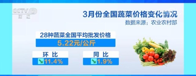 央視網(wǎng)消息:農(nóng)業(yè)農(nóng)村部發(fā)布的3月份全國“菜籃子”指數(shù)為126.44,環(huán)比下降9.47個(gè)點(diǎn),同比下降7.57個(gè)點(diǎn),其中蔬菜價(jià)格呈現(xiàn)季節(jié)性下降。