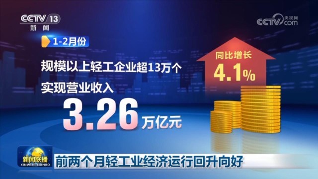 央視網(wǎng)消息(新聞聯(lián)播):中國輕工業(yè)聯(lián)合會發(fā)布數(shù)據(jù)顯示,今年前兩個月,消費(fèi)品制造業(yè)發(fā)展動力增強(qiáng),帶動輕工業(yè)經(jīng)濟(jì)運(yùn)行回升向好。1—2月,規(guī)模以上輕工企業(yè)超13萬個,實(shí)現(xiàn)營業(yè)收入3.26萬億元,同比增長4.1%。