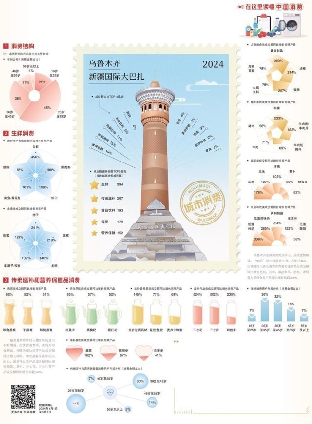 觀察、梳理和分析當?shù)叵M數(shù)據(jù),可以看出,烏魯木齊消費市場持續(xù)升溫,特別是春節(jié)期間,消費潛能得到充分釋放,呈現(xiàn)飲食消費升級等新趨勢。