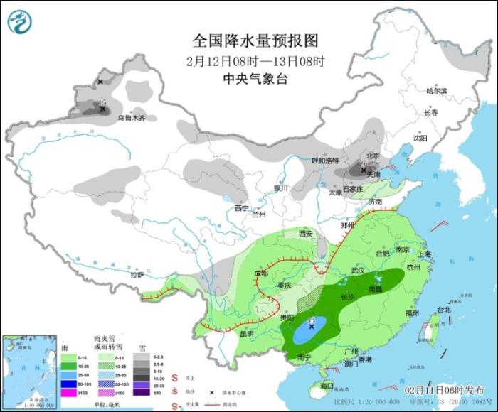全國降水量預報圖(2月11日8時-12日8時)