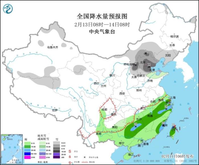 2月13日8時至14日8時,新疆北部和南疆盆地、西藏北部、青海西部和北部、甘肅河西、內(nèi)蒙古中部、東北地區(qū)南部、華北大部等地部分地區(qū)有小到中雪,其中,山西北部、河北中北部、北京、天津等地部分地區(qū)有大到暴雪(10~11毫米)。江淮西部、江南大部、西南地區(qū)東南部、華南、臺灣島等地部分地區(qū)有小到中雨,其中,湖南南部、浙江中部、福建東南部、廣西東北部、臺灣島北部等地部分地區(qū)有大雨(25~35毫米)。