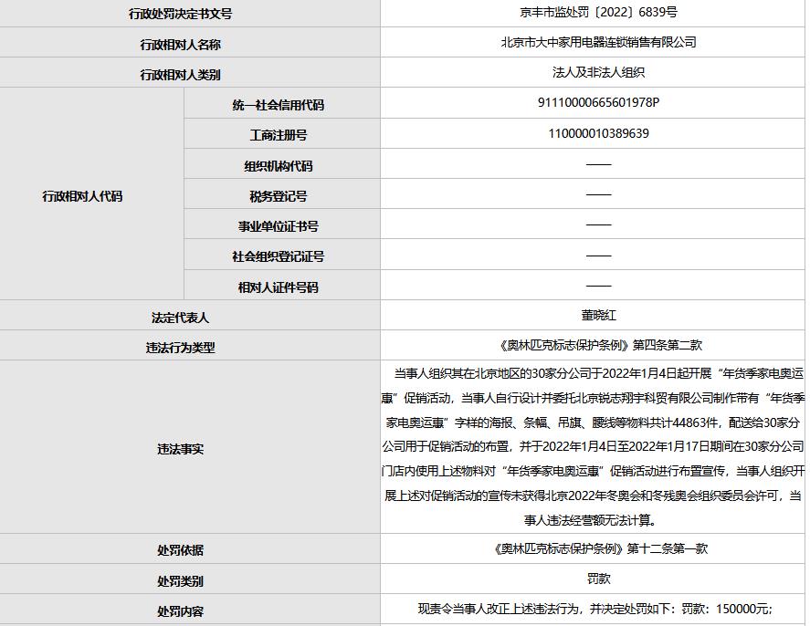 行政處罰書顯示,當(dāng)事人自行設(shè)計(jì)并委托北京銳志翔宇科貿(mào)有限公司制作帶有“年貨季家電奧運(yùn)惠”字樣的海報(bào)、條幅、吊旗、腰線等物料共計(jì)44863件,配送給30家分公司用于促銷活動(dòng)的布置,并于2022年1月4日至2022年1月17日期間在30家分公司門店內(nèi)使用上述物料對(duì)“年貨季家電奧運(yùn)惠”促銷活動(dòng)進(jìn)行布置宣傳,當(dāng)事人組織開展上述對(duì)促銷活動(dòng)的宣傳未獲得北京2022年冬奧會(huì)和冬殘奧會(huì)組織委員會(huì)許可,當(dāng)事人違法經(jīng)營(yíng)額無法計(jì)算。(完)