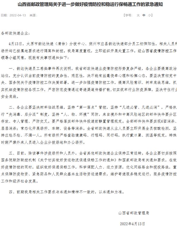 中新財(cái)經(jīng)4月15日電 13日,山西省郵政管理局發(fā)布通知緊急部署行業(yè)疫情防控和穩(wěn)運(yùn)行保通暢工作 ,要求全省從業(yè)人員要立即開展全員核酸檢測(cè),堅(jiān)持應(yīng)檢盡檢、不漏一人。除此次涉疫場(chǎng)所外,全省其他郵政快遞企業(yè)均保持正常運(yùn)轉(zhuǎn)。