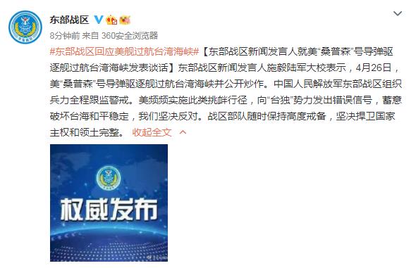 中新網(wǎng)4月27日電 據(jù)中國人民解放軍東部戰(zhàn)區(qū)官方微博消息,東部戰(zhàn)區(qū)新聞發(fā)言人27日就美“桑普森”號(hào)導(dǎo)彈驅(qū)逐艦過航臺(tái)灣海峽發(fā)表談話。東部戰(zhàn)區(qū)新聞發(fā)言人施毅陸軍大校表示,4月26日,美“桑普森”號(hào)導(dǎo)彈驅(qū)逐艦過航臺(tái)灣海峽并公開炒作。中國人民解放軍東部戰(zhàn)區(qū)組織兵力全程跟監(jiān)警戒。美頻頻實(shí)施此類挑釁行徑,向“臺(tái)獨(dú)”勢力發(fā)出錯(cuò)誤信號(hào),蓄意破壞臺(tái)海和平穩(wěn)定,我們堅(jiān)決反對(duì)。戰(zhàn)區(qū)部隊(duì)隨時(shí)保持高度戒備,堅(jiān)決捍衛(wèi)國家主權(quán)和領(lǐng)土完整。