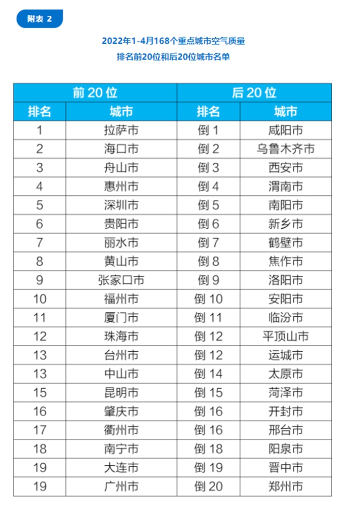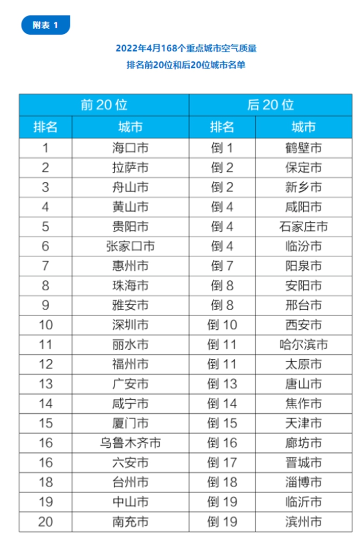 在重點(diǎn)城市排名中,4月,168個(gè)重點(diǎn)城市中,???、拉薩和舟山市等20個(gè)城市空氣質(zhì)量相對(duì)較好;鶴壁、保定和新鄉(xiāng)市等20個(gè)城市空氣質(zhì)量相對(duì)較差。
