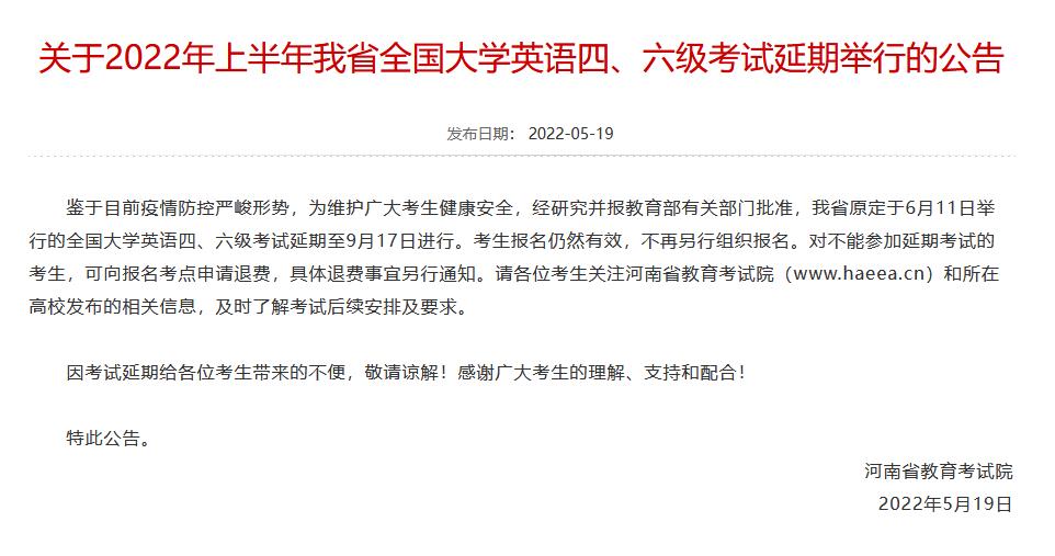 河南省全國大學英語四、六級考試延期至9月17日
