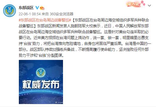 中新網(wǎng)6月1日電 據(jù)中國(guó)人民解放軍東部戰(zhàn)區(qū)官方微博1日消息,東部戰(zhàn)區(qū)新聞發(fā)言人施毅陸軍大校表示,近日,中國(guó)人民解放軍東部戰(zhàn)區(qū)在臺(tái)島周邊海空域組織多軍兵種聯(lián)合戰(zhàn)備警巡。這是針對(duì)美臺(tái)勾連采取的必要行動(dòng)。近來美方頻頻在臺(tái)灣問題上搞動(dòng)作,說一套、做一套,明里暗里慫恿支持“臺(tái)獨(dú)”勢(shì)力,將把臺(tái)灣推向危險(xiǎn)境地,自身也將面臨嚴(yán)重后果。臺(tái)灣是中國(guó)的一部分。戰(zhàn)區(qū)部隊(duì)持續(xù)加強(qiáng)練兵備戰(zhàn),不斷提高履行使命能力,堅(jiān)決挫敗任何外部勢(shì)力干涉和“臺(tái)獨(dú)”分裂圖謀。