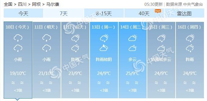 中央氣象臺預(yù)計,今起三天,馬爾康市多降雨,其中今明天有小雨,后天有陣雨。早晚氣溫較低,最低氣溫在10℃左右,最高氣溫19~23℃。