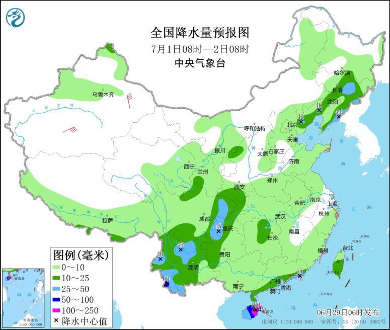 圖2全國降水量預(yù)報圖(6月29日08時-30日08時)
