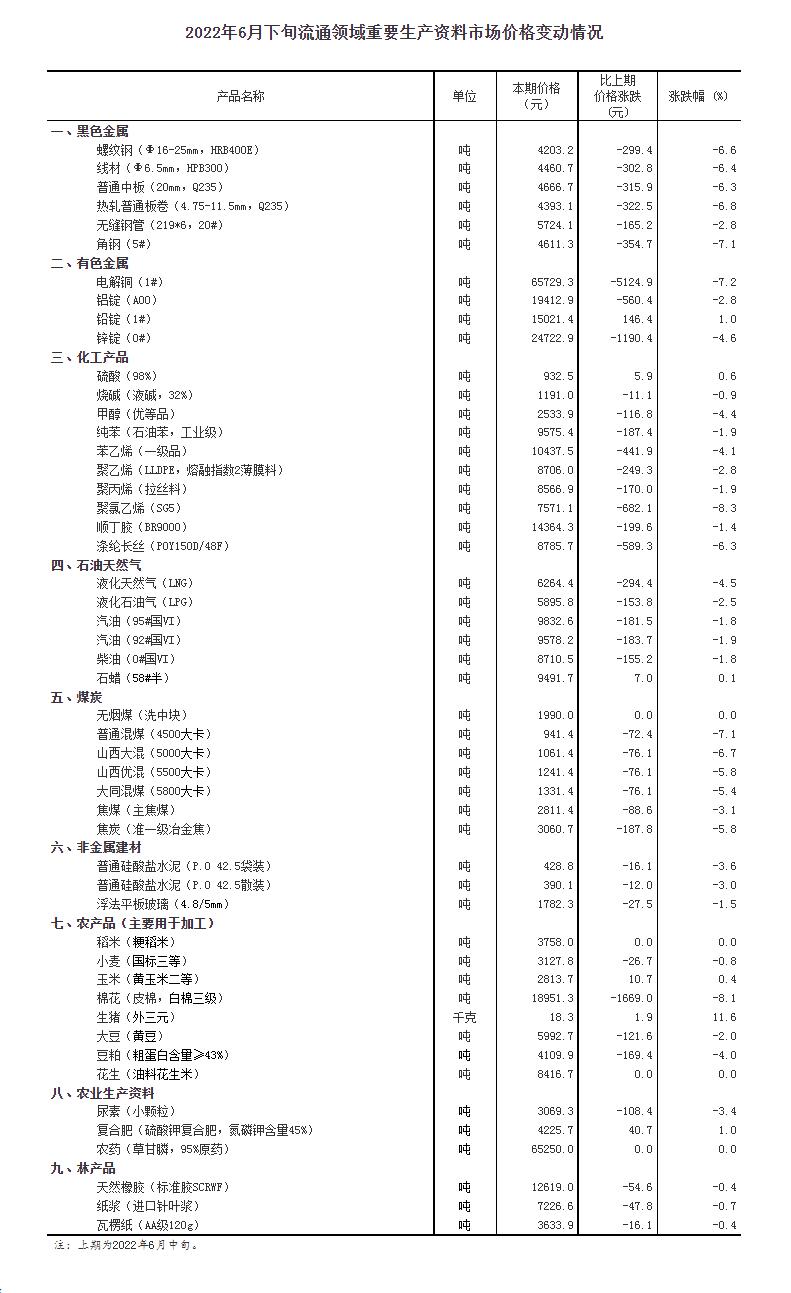 中新網(wǎng)7月4日電 國(guó)家統(tǒng)計(jì)局網(wǎng)站4日公布2022年6月下旬流通領(lǐng)域重要生產(chǎn)資料市場(chǎng)價(jià)格變動(dòng)情況。據(jù)對(duì)全國(guó)流通領(lǐng)域9大類50種重要生產(chǎn)資料市場(chǎng)價(jià)格的監(jiān)測(cè)顯示,2022年6月下旬與6月中旬相比,6種產(chǎn)品價(jià)格上漲,40種下降,4種持平。其中,生豬(外三元)價(jià)格報(bào)18.3元/千克,環(huán)比上漲11.6%。(中新財(cái)經(jīng))