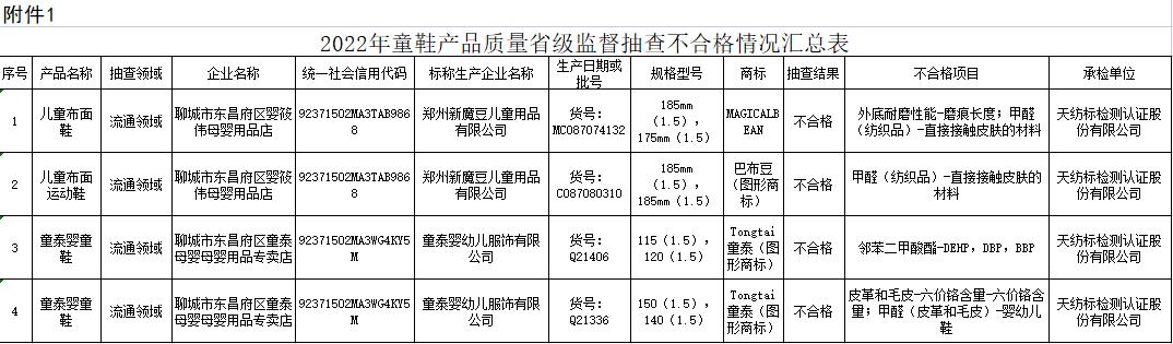 不合格產品涉及:鄭州新魔豆兒童用品有限公司生產的“MAGICALBEAN”牌兒童布面鞋、鄭州新魔豆兒童用品有限公司生產的“巴布豆”牌兒童布面運動鞋、2批次童泰嬰幼兒服飾有限公司生產的“Tongtai童泰”牌童泰嬰童鞋。