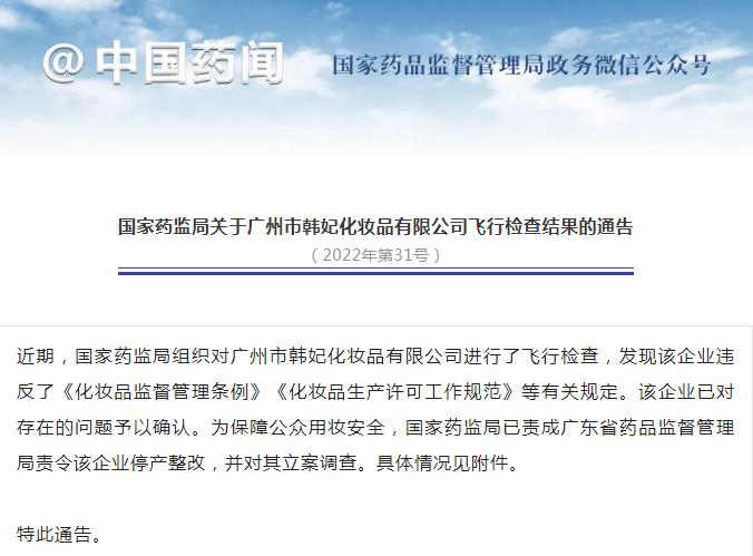 國家藥監(jiān)局:對廣州市韓妃化妝品有限公司立案調(diào)查