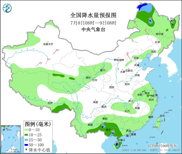 7月8日08時至9日08時,內(nèi)蒙古東北部、黑龍江西部和東北部、云南南部、華南西部和南部等地部分地區(qū)有中到大雨,其中,內(nèi)蒙古東北部等地局地有暴雨(50~90毫米)。內(nèi)蒙古中東部、新疆沿天山地區(qū)和南疆盆地等地部分地區(qū)有4~6級風;南海南部海域有5~7級、陣風8級的偏西風。