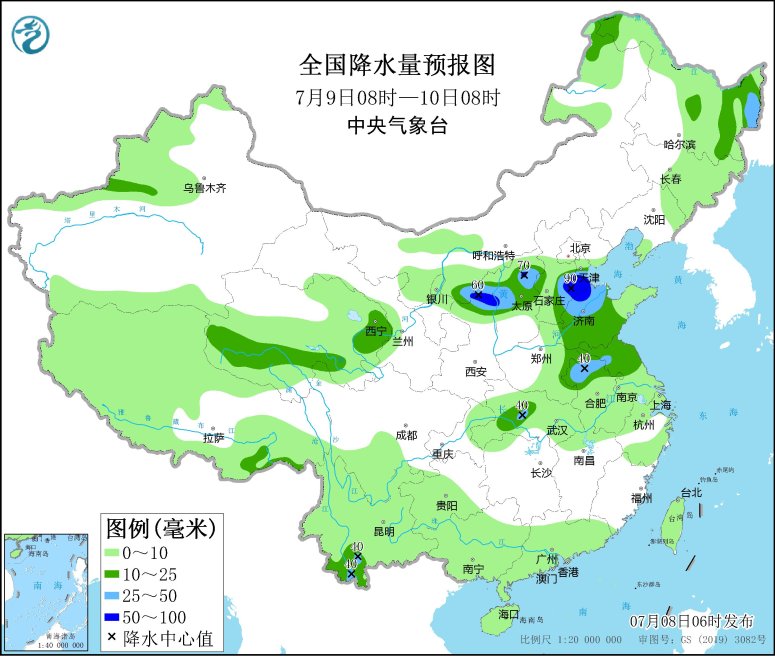 7月9日08時至10日08時,黑龍江東北部、陜西北部、山西北部、河北中南部、黃淮東部、江淮、云南西南部等地部分地區(qū)有中到大雨,其中,陜西北部、山西北部、河北中南部、山東北部等地局地有暴雨(50~90毫米);南海南部海域有5~7級、陣風8級的偏西風。