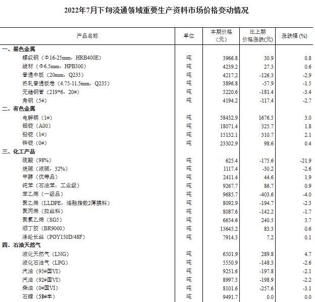 中新網(wǎng)8月4日電 國家統(tǒng)計局4日公布2022年7月下旬流通領域重要生產(chǎn)資料市場價格變動情況,據(jù)對全國流通領域9大類50種重要生產(chǎn)資料市場價格的監(jiān)測顯示,2022年7月下旬與7月中旬相比,15種產(chǎn)品價格上漲,32種下降,3種持平。
