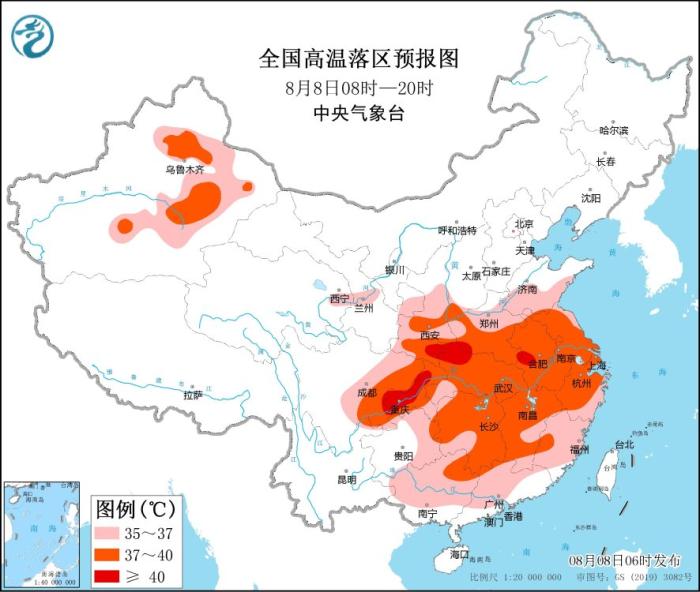 預計8月8日白天,四川東部、重慶、陜西中南部、山東中南部、河南、安徽、江蘇、上海、湖北、貴州東部、湖南、江西、浙江、福建、廣西中北部、廣東中北部及新疆南疆盆地東部和北疆南部等地有35~39℃高溫天氣,其中,陜西東南部、湖北西北部、重慶中西部等地局地可達40℃或以上。中央氣象臺8月8日06時繼續(xù)發(fā)布高溫橙色預警。
