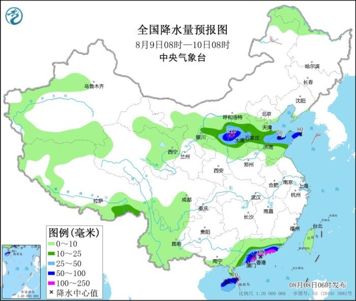 8月9日08時至10日08時,內(nèi)蒙古河套地區(qū)、西藏東南部、寧夏北部、陜西北部、山西中北部、河北中南部、山東北部、廣東南部沿海、海南島等地部分地區(qū)有中到大雨,其中,陜西北部、山西中部、山東中東部、廣東南部沿海、海南島北部等地部分地區(qū)有暴雨或大暴雨(100~150毫米)。內(nèi)蒙古東北部部分地區(qū)有4~5級風。南海東北部海域?qū)⒂?~7級、陣風8級增大到7~8級、陣風9級的東南風。