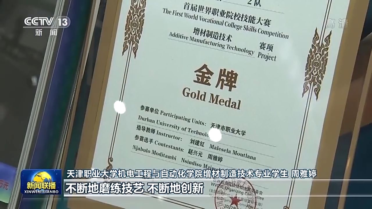 天津職業(yè)大學機電工程與自動化學院增材制造技術專業(yè)學生 周雅婷:我覺得我是這個時代的幸運兒,在(學校)實訓基地,其實每天都是實戰(zhàn),我們的老師也是技能大師。以前我覺得大國重器是高不可攀的,當我站在世界級的領獎臺上,我才發(fā)現(xiàn),將平凡做到極致,不斷地磨煉技藝、不斷地創(chuàng)新,也是在為制造大國重器蓄積力量。