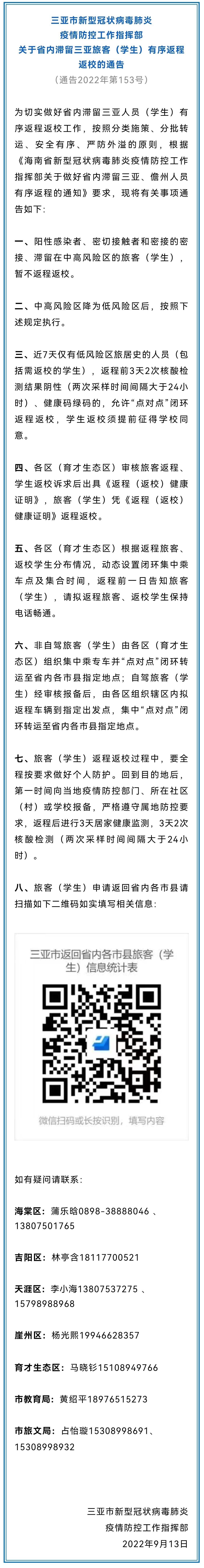 9月13日,總臺(tái)記者從三亞市新型冠狀病毒肺炎疫情防控工作指揮部獲悉, 為切實(shí)做好海南省內(nèi)滯留三亞人員(學(xué)生)有序返程返校工作,按照分類施策、分批轉(zhuǎn)運(yùn)、安全有序、嚴(yán)防外溢的原則,根據(jù)《海南省新型冠狀病毒肺炎疫情防控工作指揮部關(guān)于做好省內(nèi)滯留三亞、儋州人員有序返程的通知》要求,現(xiàn)將有關(guān)事項(xiàng)通告如下: