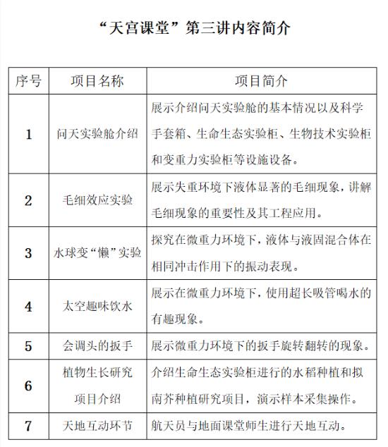 本次太空授課活動(dòng)將繼續(xù)采取天地互動(dòng)方式進(jìn)行,3名航天員將在軌介紹展示中國(guó)空間站問天實(shí)驗(yàn)艙工作生活場(chǎng)景,演示微重力環(huán)境下毛細(xì)效應(yīng)實(shí)驗(yàn)、水球變“懶”實(shí)驗(yàn)、太空趣味飲水、會(huì)調(diào)頭的扳手以及植物生長(zhǎng)研究項(xiàng)目介紹,并與地面課堂進(jìn)行互動(dòng)交流,旨在傳播普及載人航天知識(shí),激發(fā)廣大青少年對(duì)科學(xué)的興趣。