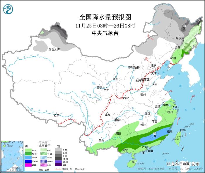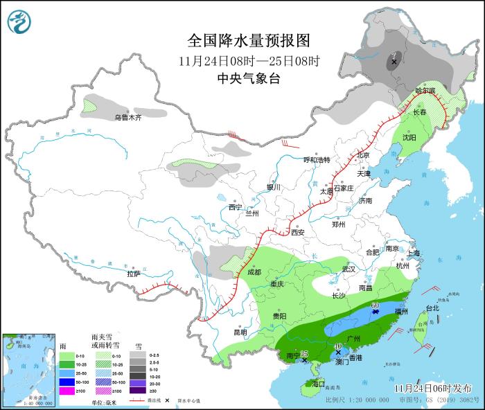 11月24日08時至25日08時,內(nèi)蒙古東部、東北地區(qū)、新疆沿天山地區(qū)、甘肅河西、川西高原等地部分地區(qū)有小到中雪或雨夾雪,其中,內(nèi)蒙古東北部局地有大雪(5~7毫米)。江南南部、華南大部等地部分地區(qū)有中到大雨,局地暴雨(50~60毫米)。內(nèi)蒙古西部部分地區(qū)有5~7級風(fēng)(見圖1)。