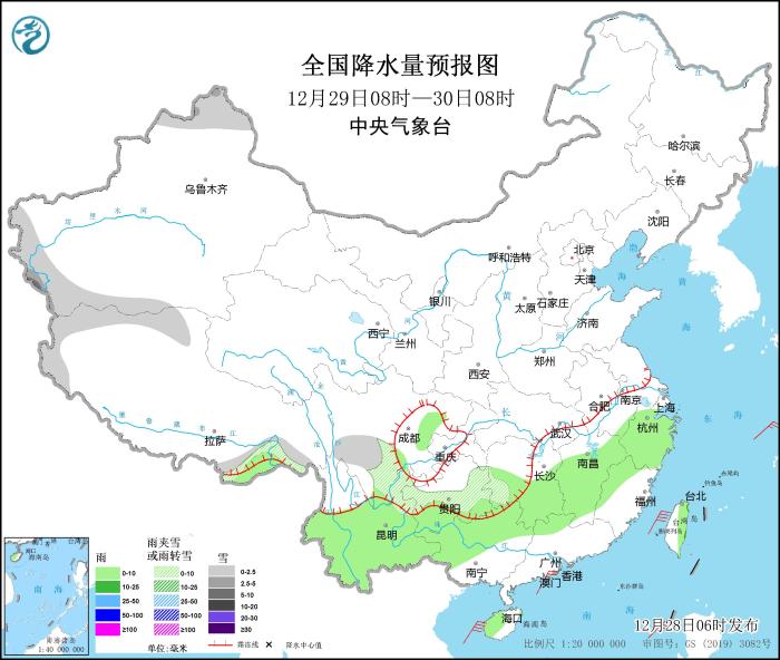 12月28日08時(shí)至29日08時(shí),內(nèi)蒙古東北部、黑龍江中東部和北部、西藏東部、川西高原大部、云南北部、貴州、湖南西部、重慶東南部、湖北西南部、江西北部、安徽南部、浙江西部等地部分地區(qū)有小雪或雨夾雪,其中,湖南西部、貴州中東部、云南東北部等地局地有中雪或大雪(5~7毫米)。江南大部、西南地區(qū)大部、廣西大部、廣東北部、海南島西部和東部、臺灣島東部等地部分地區(qū)有小雨,其中,云南東南部、臺灣島東部局地有中雨或大雨。內(nèi)蒙古中部等地部分地區(qū)有4~5級風(fēng)。東海南部、臺灣海峽及以東洋面、巴士海峽、南海中北部等地部分地區(qū)有6~7級風(fēng)(見圖1)。