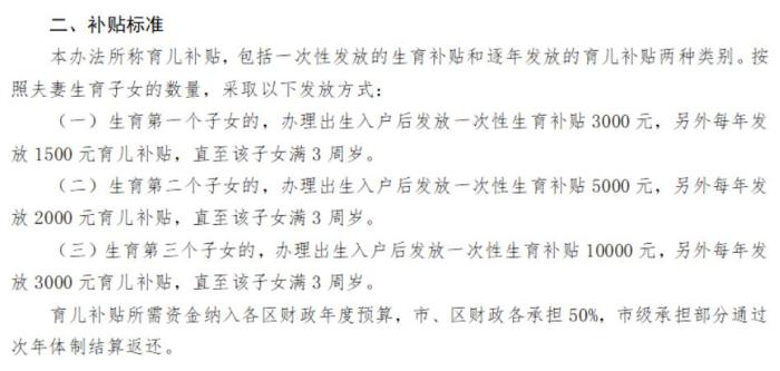 辦法擬規(guī)定,按照夫妻生育子女的數(shù)量,發(fā)放育兒補貼。其中,生育第一個子女的,辦理出生入戶后發(fā)放一次性生育補貼3000元,另外每年發(fā)放1500元育兒補貼,直至該子女滿3周歲;生育第二個子女的,辦理出生入戶后發(fā)放一次性生育補貼5000元,另外每年發(fā)放2000元育兒補貼,直至該子女滿3周歲;生育第三個子女的,辦理出生入戶后發(fā)放一次性生育補貼10000元,另外每年發(fā)放3000元育兒補貼,直至該子女滿3周歲。育兒補貼所需資金納入各區(qū)財政年度預算,市、區(qū)財政各承擔50%,市級承擔部分通過次年體制結(jié)算返還。(中新財經(jīng))