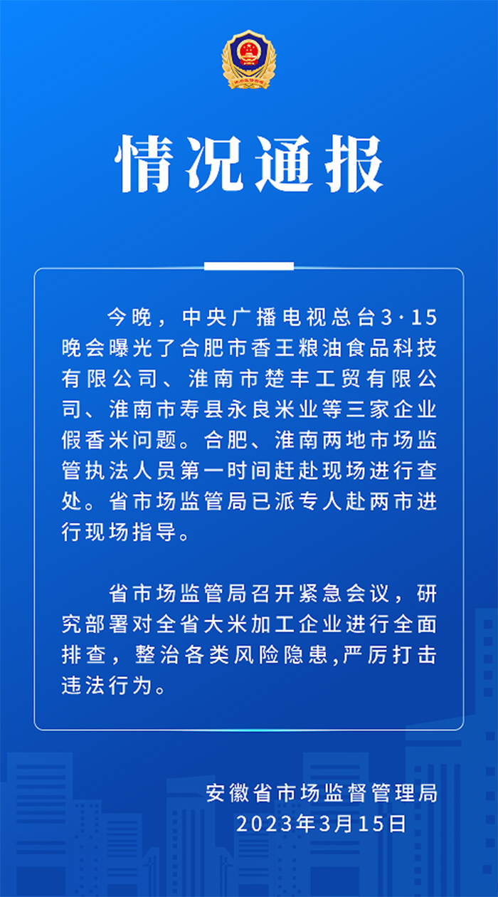 聲明還稱,安徽省市場監(jiān)管局召開緊急會議,研究部署對全省大米加工企業(yè)進行全面排查,整治各類風(fēng)險隱患,嚴厲打擊違法行為。(中新財經(jīng))