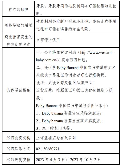 中新網4月3日電 據(jù)“上海市場監(jiān)管”微信公眾號3日消息,上海童榛貿易有限公司自2023年4月3日至2023年10月2日召回2010年1月至2022年8月生產的香蕉寶寶牌硅膠嬰兒牙膠、玉米硅膠嬰兒牙膠牙刷,共計983897件。
