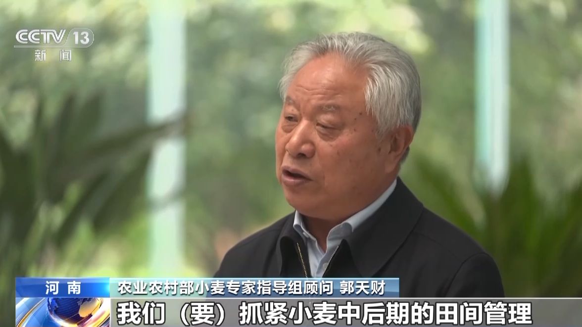 農(nóng)業(yè)農(nóng)村部小麥專家指導(dǎo)組顧問 郭天財(cái):我們要抓緊小麥中后期的田間管理,一個(gè)措施一個(gè)措施地把它落實(shí)落地,一個(gè)環(huán)節(jié)一個(gè)環(huán)節(jié),我們把它抓緊抓好,來鞏固和發(fā)展當(dāng)前苗情持續(xù)向好的態(tài)勢,今年小麥豐收還是很有希望的。