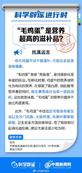純屬謠言!“毛雞蛋”就是“死胎蛋”,是雞蛋孵化至半途的胚胎?!懊u蛋”的營養(yǎng)價(jià)值并不比雞蛋更高,其中還可能含有寄生蟲以及沙門氏菌、大腸桿菌、傷寒桿菌等致病菌,衛(wèi)生安全很難保證,吃了極容易引起消化道疾病。(來源:科學(xué)辟謠、中國新聞網(wǎng)微博)