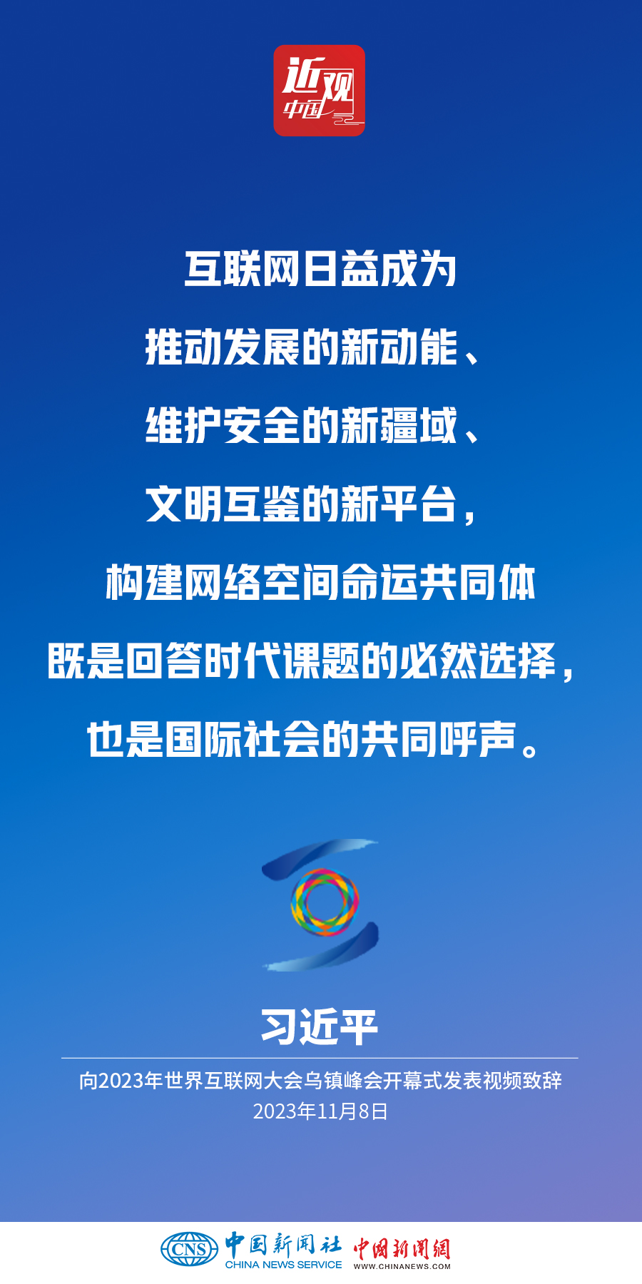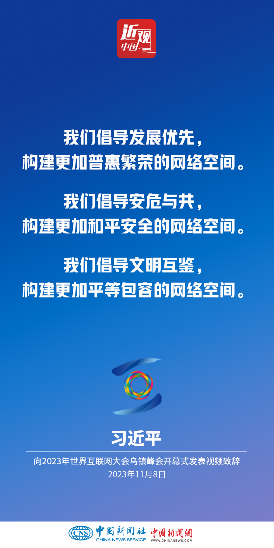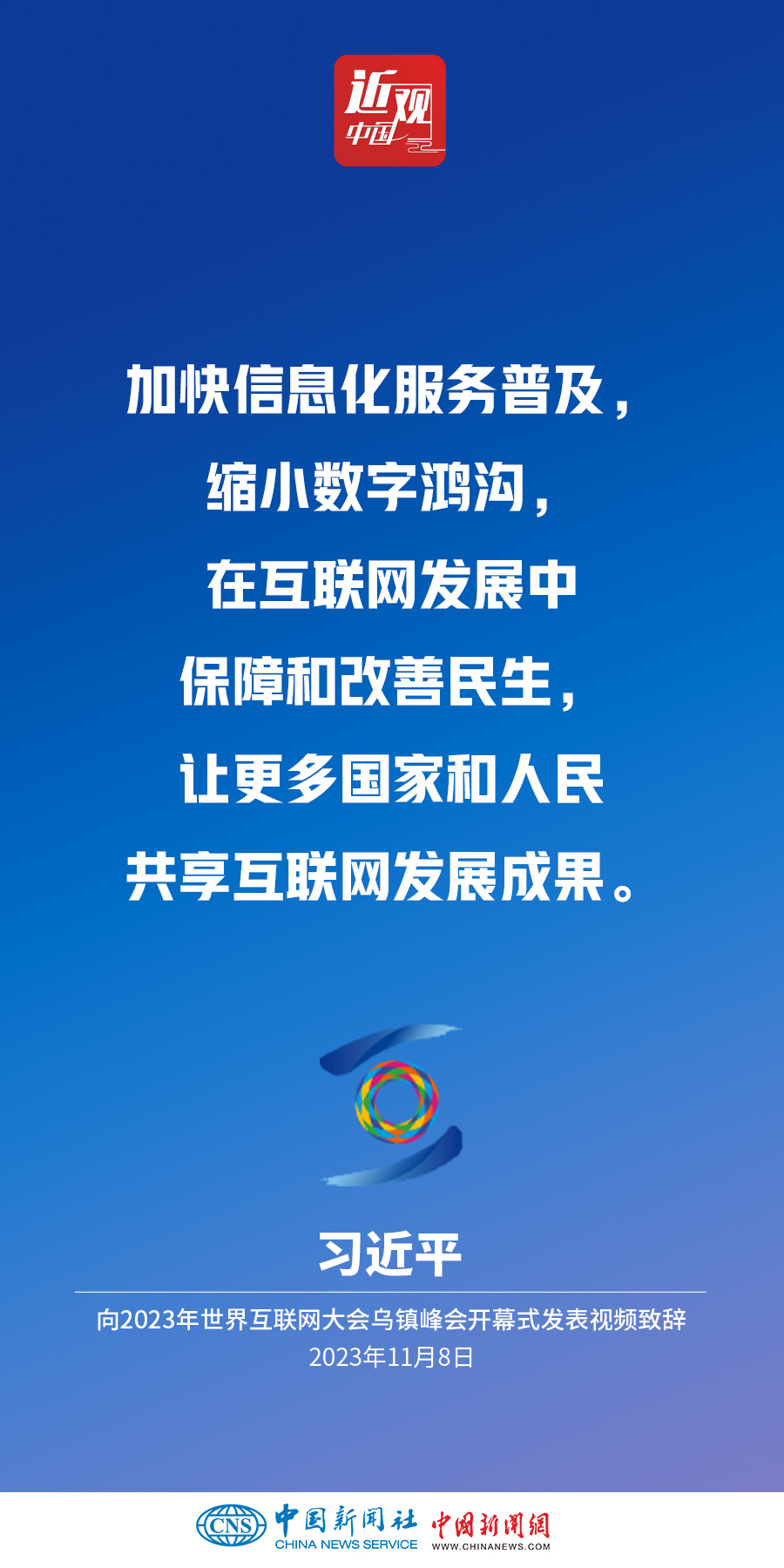 11月8日上午,國(guó)家主席習(xí)近平向2023年世界互聯(lián)網(wǎng)大會(huì)烏鎮(zhèn)峰會(huì)開(kāi)幕式發(fā)表視頻致辭。他指出——