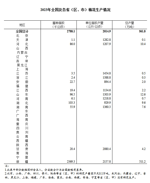 國家統(tǒng)計局:2023年全國棉花總產(chǎn)量561.8萬噸