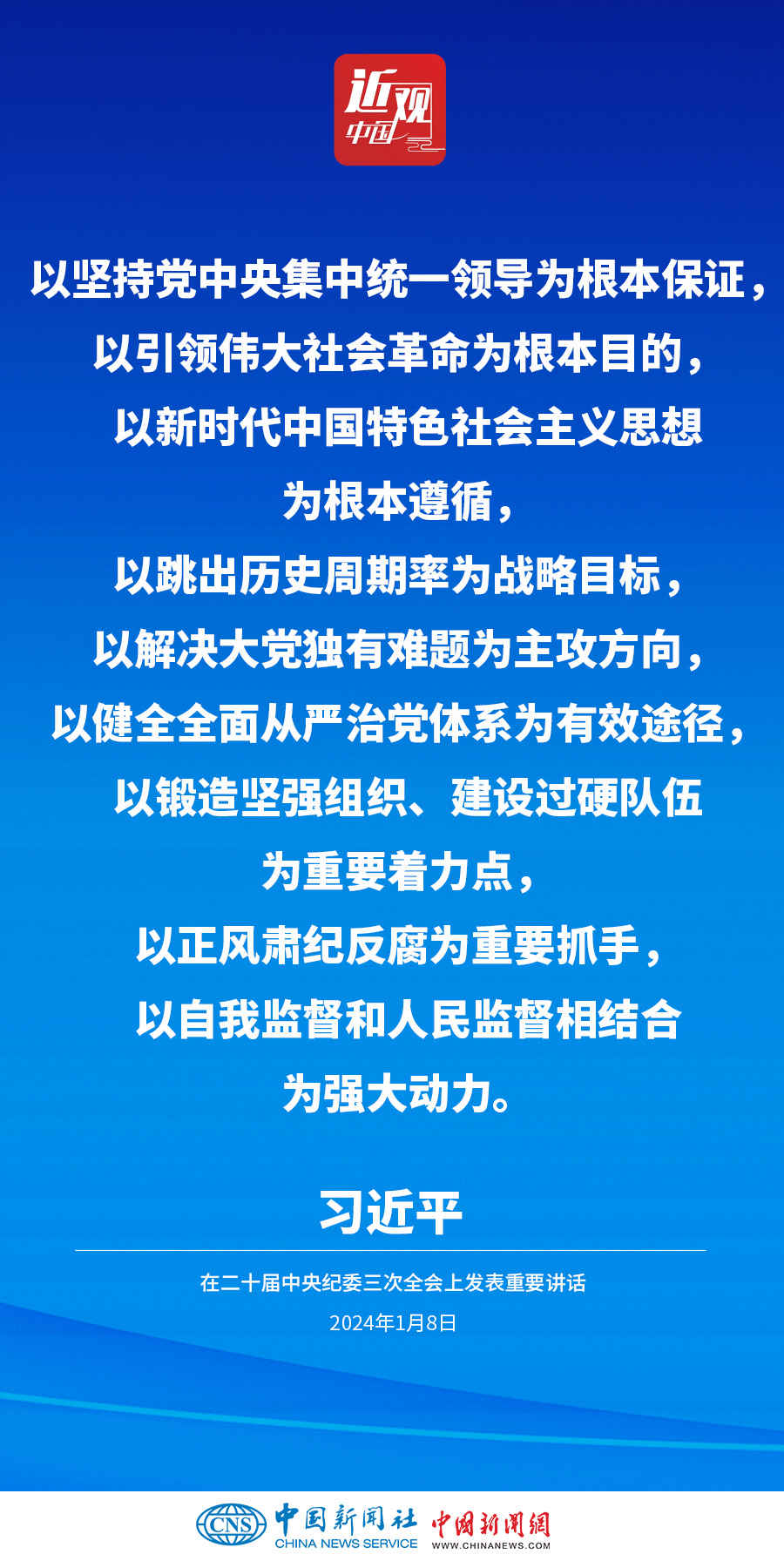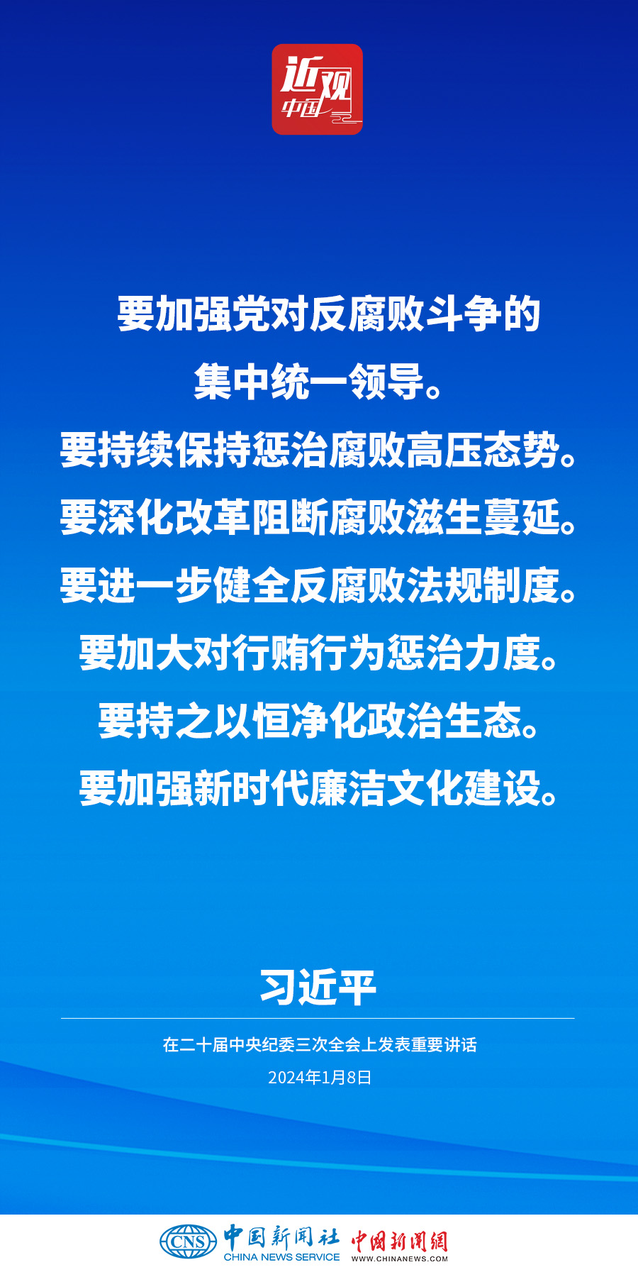中共中央總書記、國家主席、中央軍委主席習(xí)近平8日上午在中國共產(chǎn)黨第二十屆中央紀律檢查委員會第三次全體會議上發(fā)表重要講話。他強調(diào)——