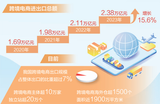 據(jù)海關測算,2023年,我國跨境電商進出口總額2.38萬億元,增長15.6%。其中,出口1.83萬億元,增長19.6%;進口5483億元,增長3.9%??缇畴娚炭焖侔l(fā)展,既滿足了國內消費者多樣化個性化需求,又助力我國產品通達全球,成為外貿發(fā)展的重要動能。