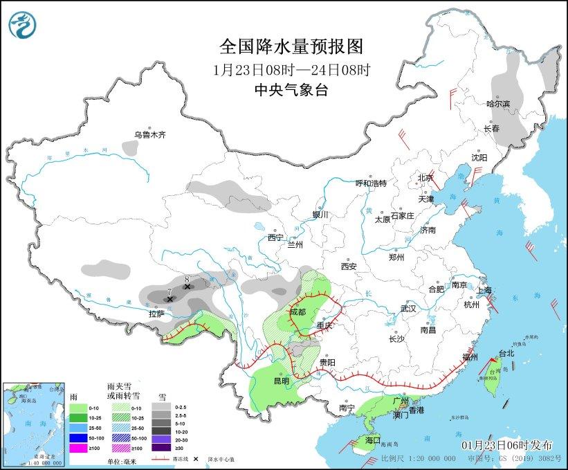 1月25日08時(shí)至26日08時(shí),西藏東部、青海南部、甘肅南部、川西高原北部、四川南部、貴州西部、云南東北部和西北部等地部分地區(qū)有小到中雪或雨夾雪。云南大部、貴州西南部等地部分地區(qū)有小到中雨(見(jiàn)圖5)。